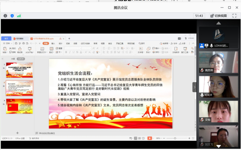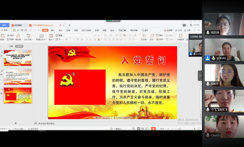 下午14点30分,线上党组织生活会正式开始,主持人首先给党员同志们简单介绍了习近平总书记给复旦大学《共产党宣言》展示馆党员志愿服务队全体队员回信的事情经过,信中习近平总书记勉励他们继续讲好关于理想信念的故事,并对全国广大党员特别是青年党员提出殷切期望。总书记的深情寄语和殷切嘱托,激励着各条战线上的青年党员。大家表示,要在学思践悟中坚定理想信念,在奋发有为中践行初心使命,努力为实现中华民族伟大复兴的中国梦贡献智慧和力量。 随后主持人组织党员同志们一起观看视频《心有所信 方能行远——习近平总书记给复旦大学青年师生党员的回信激励广大青年党员笃定前行 走好新时代长征路》,视频中习近平总书记强调了坚定理想信念的重要性,作为青年党员的我们,应当坚定理想信念,锤炼意志品质,做到知行合一、不断加深对于“四史”的学习,要把“四史”作为坚定理想信念的活教材,从中感受中国共产党人的强大精神力量,奋发有为,拼搏奋斗。观看完视频,党员同志们对视频中青年党员的入党宣誓印象深刻不已。随后,主持人就带领党员同志们重温了入党誓词,并紧握右拳,面对党旗进行了庄严的宣誓。