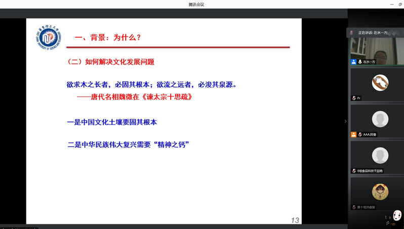 “文以载道,文以化人”。向云发从“什么是文化?什么是传统文化?”为导言,引出本堂课主题并进一步深入解读。一是从如何更好的解决“失语”、“挨骂”、“误解”的问题、如何解决文化发展问题、如何应对现实发展之困、如何回应时代之问出发,引出习近平对传统文化的重要论述并分析缘由。二是通过科学方法论分析,讲解了习近平通过唯物辩证地继承,创造性转化和创新性发展、以及既要反对教条主义、又要反对历史虚无主义、文化虚无主义等几个重要方面,阐述了对传统文化的传承与升华。三是讲述中国传统文化在实际的运用与发展过程中,主要表现为传统富民社会与全面建成小康社会、古代法治思想与建设社会主义法治国家、传统廉政文化与反腐倡廉建设、从古代丝绸之路到“一带一路”建设等几大方面。向云发深入地讲解了习近平对中国传统文化的重要论述,进一步为同学们学习和理解中国的传统文化奠定了良好的基础。