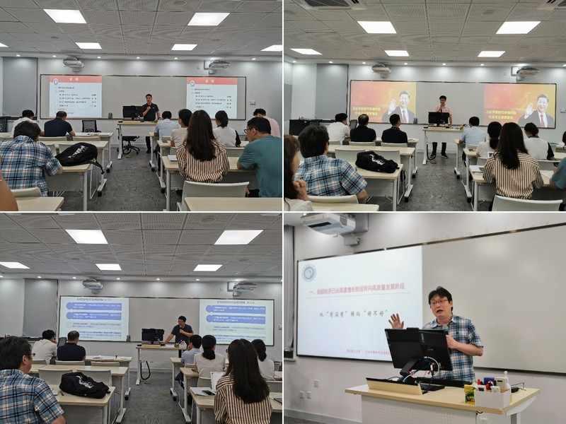会议伊始,邱卫东就习近平新时代中国特色社会主义思想课程的设计思路、总体框架及教学模式作了介绍。接着,我院朱忆天教授和汪斌锋、张驰副教授分别围绕开学第一讲——学习“七一”重要讲话、立足时代之基、回答时代之问的科学理论--习近平新时代中国特色社会主义思想概论,贯彻新发展理念、推动高质量发展等专题进行了示范授课。卢杨副教授围绕课程体系和课程内容对实践教学环节进行了布置和示范。就课程建设中存在的情况和问题,全体教师在示范课后进行了深入地交流研讨。