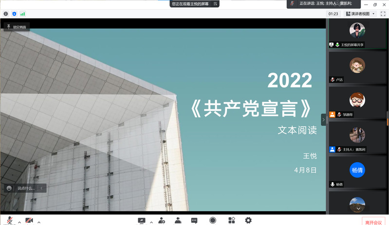 4月8日下午,ylzzcom永利总站线路检测第三期“云端品读 书香战疫”经典著作读书会以腾讯会议的形式顺利举行,学院2021级博士研究生王悦带领大家学习了《共产党宣言》(以下简称《宣言》),学院青年教师张九红受邀为学生答疑解惑。读书会由学院研究生会文艺部雷凯利主持,学院党委副书记杨倩、团委书记胡博成和硕博学生50余人参加。
