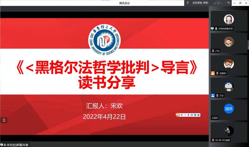 4月22日下午,ylzzcom永利总站线路检测第四期“云端品读 书香战疫”经典著作读书会以腾讯会议的形式顺利举行。学院2021级博士研究生宋欢带领大家学习了《<黑格尔法哲学批判>导言》(以下简称《导言》),学院副院长邱卫东受邀为学生答疑解惑。读书会由学院研究生会文艺部李方正主持,学院党委副书记杨倩、团委书记胡博成和硕博学生50余人参加。