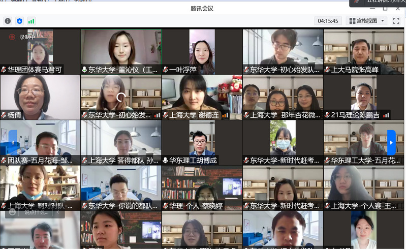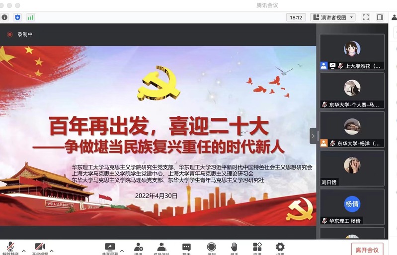 在五四青年节到来之际,为深入学习贯彻习近平总书记在中国人民大学的重要讲话精神,推动党史学习教育常态化长效化,4月30日,由华东理工大学、东华大学、上海大学三所高校ylzzcom永利总站线路检测联合组织的“百年再出发,喜迎二十大——争做堪当民族复兴重任的时代新人”党史专题知识竞赛成功举办。ylzzcom永利总站线路检测党委副书记杨倩、团委书记胡博成,东华大学ylzzcom永利总站线路检测党委书记戴叶萍、青年教师白虎、任园,上海大学ylzzcom永利总站线路检测党委副书记、副院长张高峰,学生党建中心主任、研究生辅导员谢德连出席活动。来自三所高校马院的12名个人赛选手、9支团体赛代表队及三校百余位青年学子参与其中。