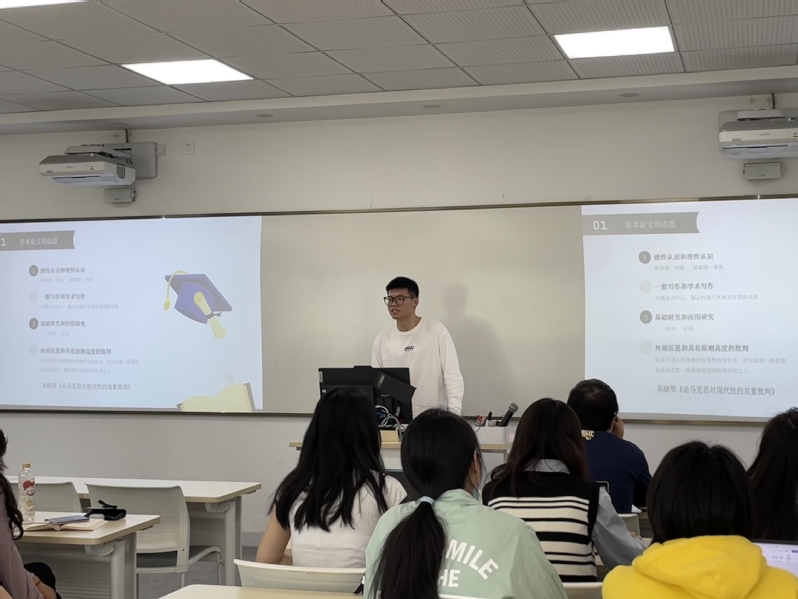 高海波结合自身科研经历,从“前期写作奠基”“确定论文选题”“论文写作展开”“论文修改过程”“论文投稿过程”五个方面展开了论文写作经验的主题分享。高海波分享了自己在华东理工大学马院的学习经历,指出要善于结合导师研究方向开展科研,同时在写作前要进行大量阅读,以保证和提升论文质量。