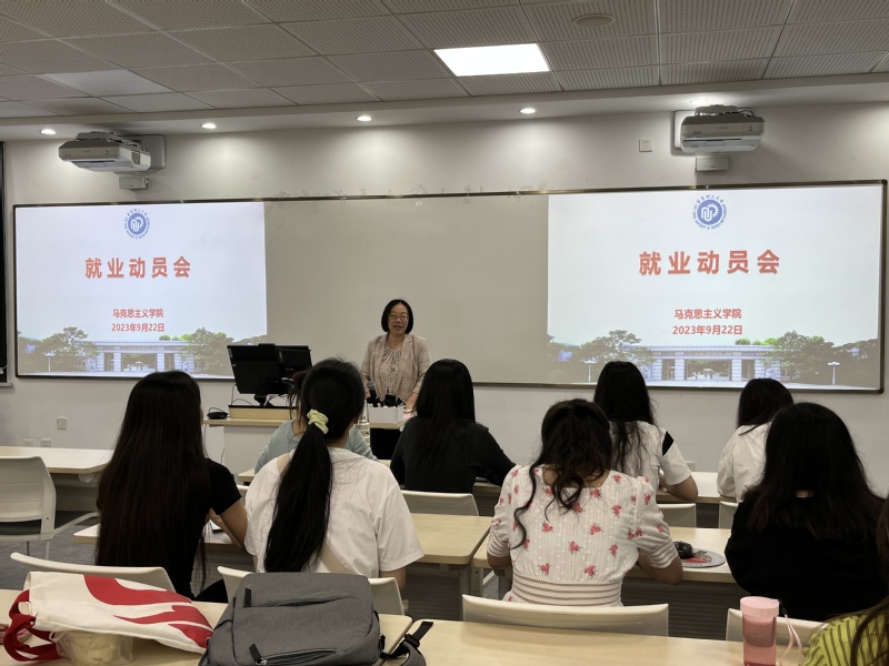 杨倩介绍了近年来我国大学生的总体就业形势,用详细的数据分析了学院近三年毕业生的总体就业情况和具体毕业去向。同时,她还对毕业生关心的各种就业形式、三方协议签订、档案户口迁移等问题进行了详细说明。针对马院硕士生2.5年学制的特点,她希望同学们能够处理好毕业和就业的关系,充分利用求职高峰期去积极进行各种尝试,进一步降低就业预期,转变就业观念。
