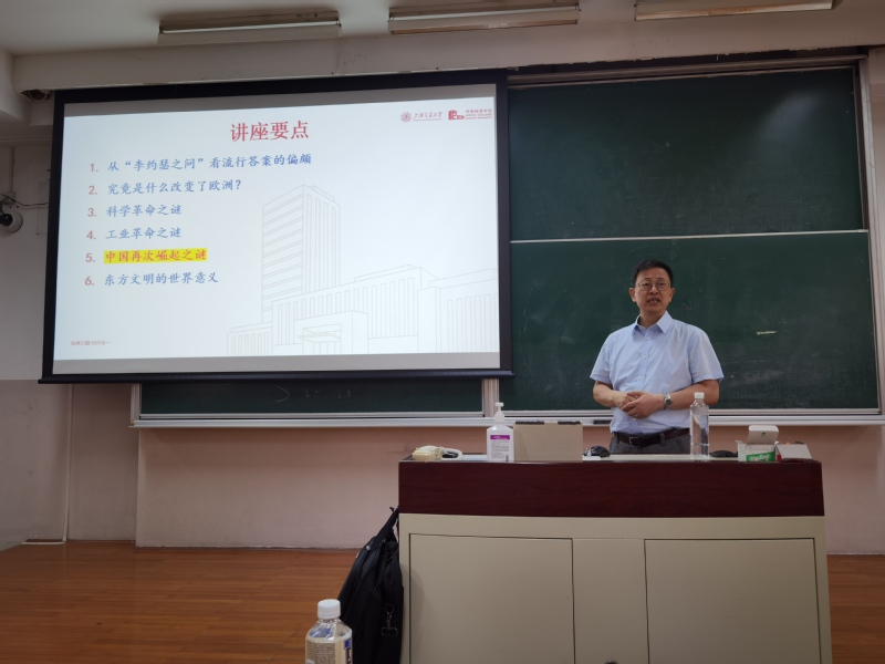 文一教授从工业革命前的世界秩序为背景,带领同学们探寻促使欧洲在近代发生改变的因素,从而回答科学与工业革命之谜,并进一步解答了中国再次崛起之谜。文教授最终得出结论:17-18世纪的科学革命其实是热兵器战争下军备竞赛的产物,社会需求才是推动科学革命和技术变革的最大动力;解开“科学革命密码”具有重大的时代意义,欧洲文明的基因密码就是:不在国家竞争中崛起,就在国家竞争中灭亡。